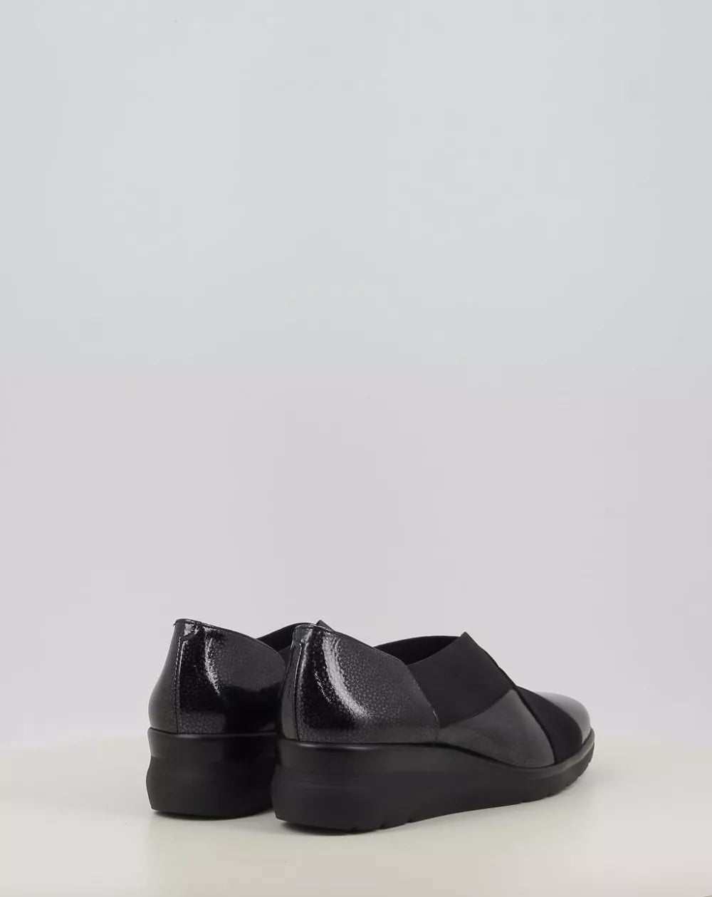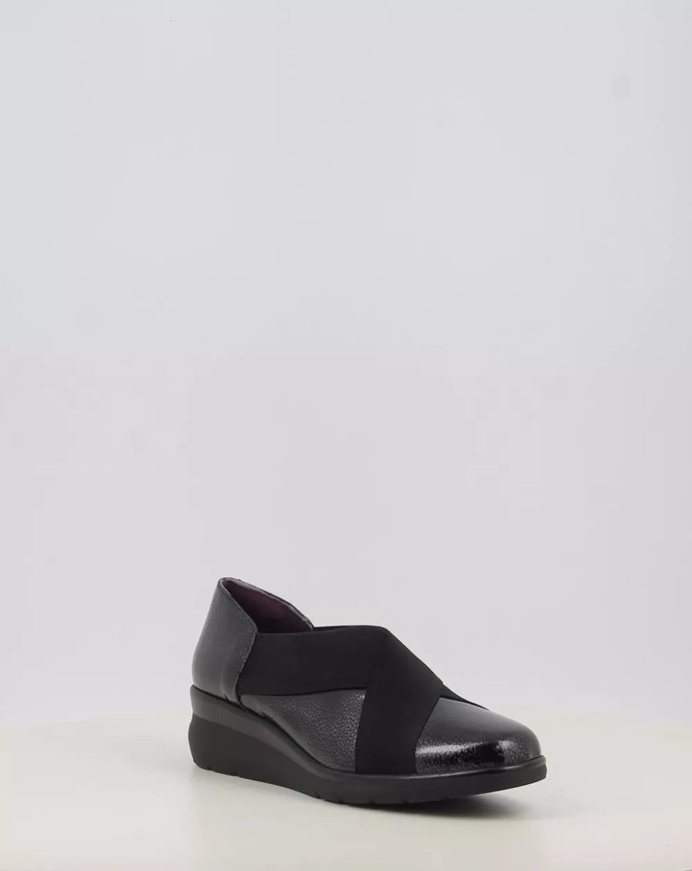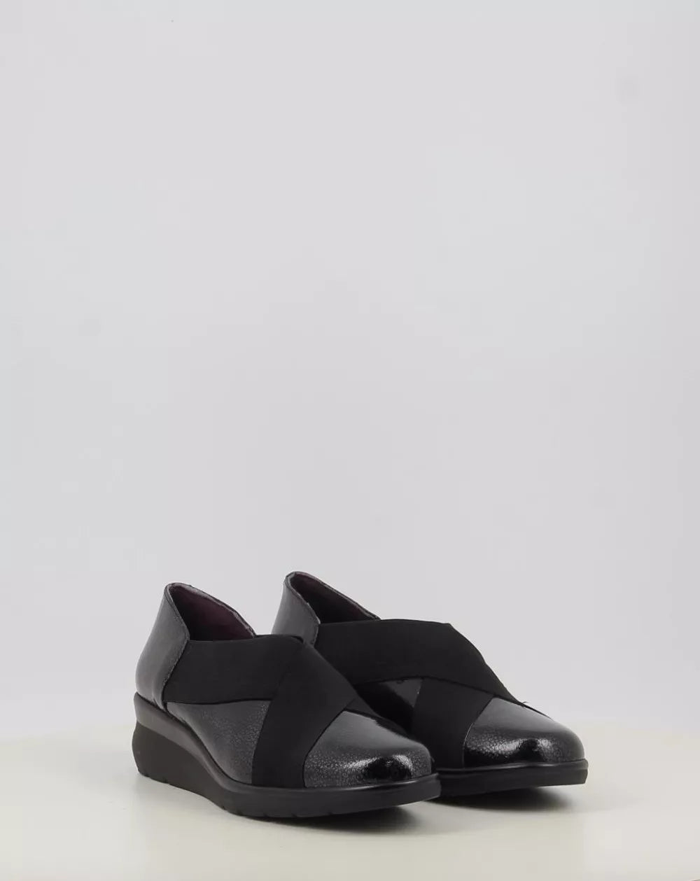 Zapato elegante en piel natural en charol con gomas elásticas cruzadas para un buen ajuste al pie y un fácil calce, forro interior en tejido Intech hipoalérgico y transpirable. Dispone de plantilla extraíble que permite colocar una plantilla própia. Suela ligera y flexible.