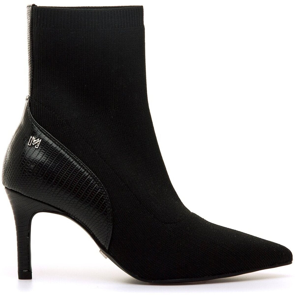 Botines negros de tacón para mujer, modelo Nuoro de Mariamare con diseño tipo calcetín. Su ajuste elástico se adapta al pie y al tobillo, ofreciendo una sensación cómoda y estilizada. La puntera fina y el detalle texturizado en la parte trasera aportan un toque moderno y elegante. El tacón alto realza la figura sin renunciar a la estabilidad.