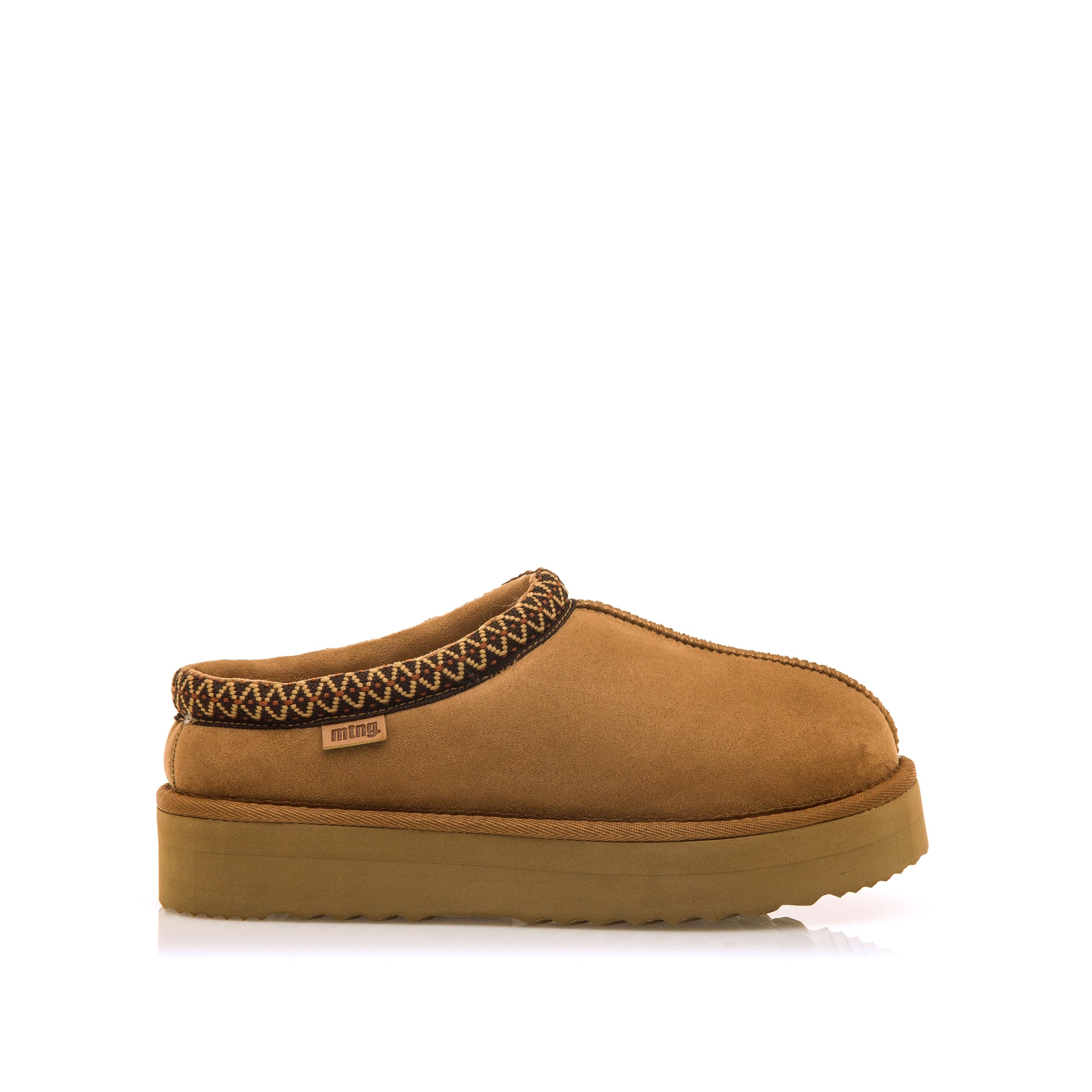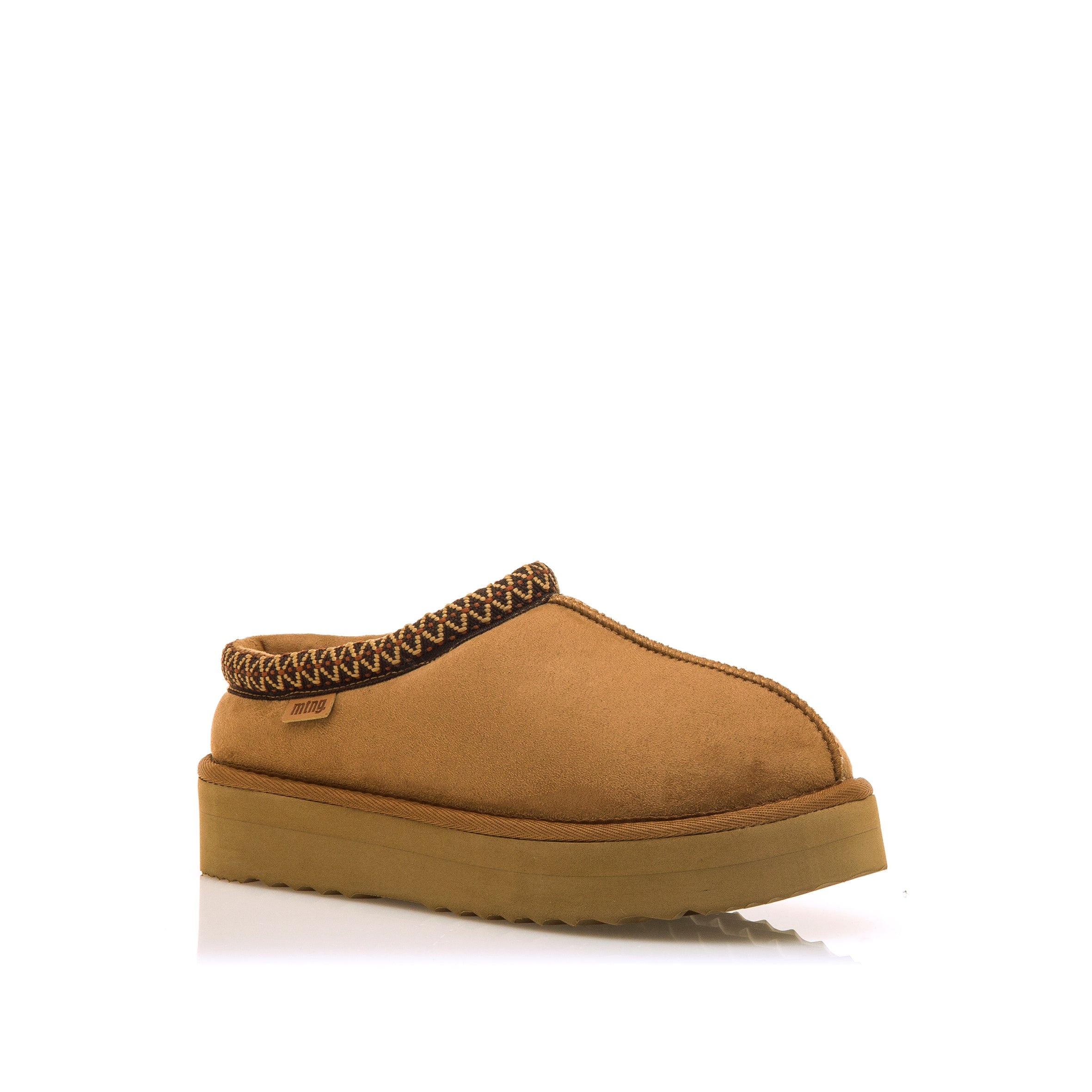Zueco de color camel para mujer de la marca Mustang, modelo Nivia, con diseño tipo slipper cerrado y suela elevada. Este modelo destaca por su ribete en contraste con dibujo étnico que rodea la abertura y su costura visible a lo largo del empeine. La suela gruesa con acabado dentado mejora la tracción y el confort, ideal para el uso diario dentro o fuera de casa. Un calzado versátil con interior tipo pelo para los días fríos.