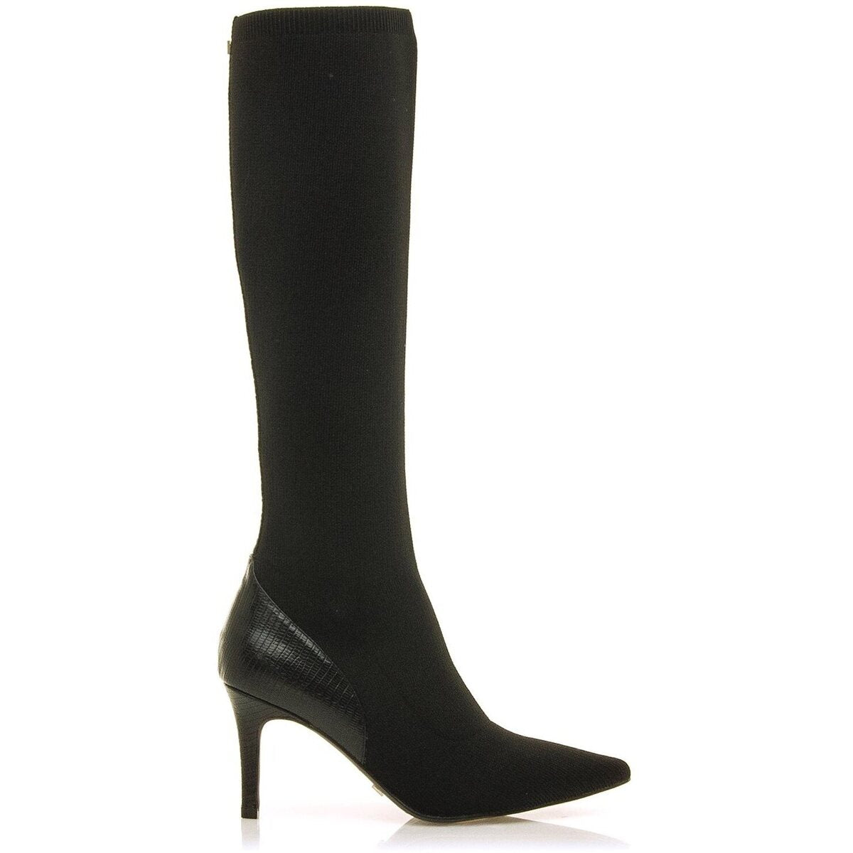 Botas altas de color negro para mujer de Mariamare, Modelo Nuoro con diseño tipo calcetín que se ajusta a la pierna. La combinación de materiales y el detalle texturizado en el talón aportan un toque moderno. La punta afilada y el tacón fino estilizan la figura, convirtiéndolas en un calzado ideal para outfits de noche y ocasiones especiales.