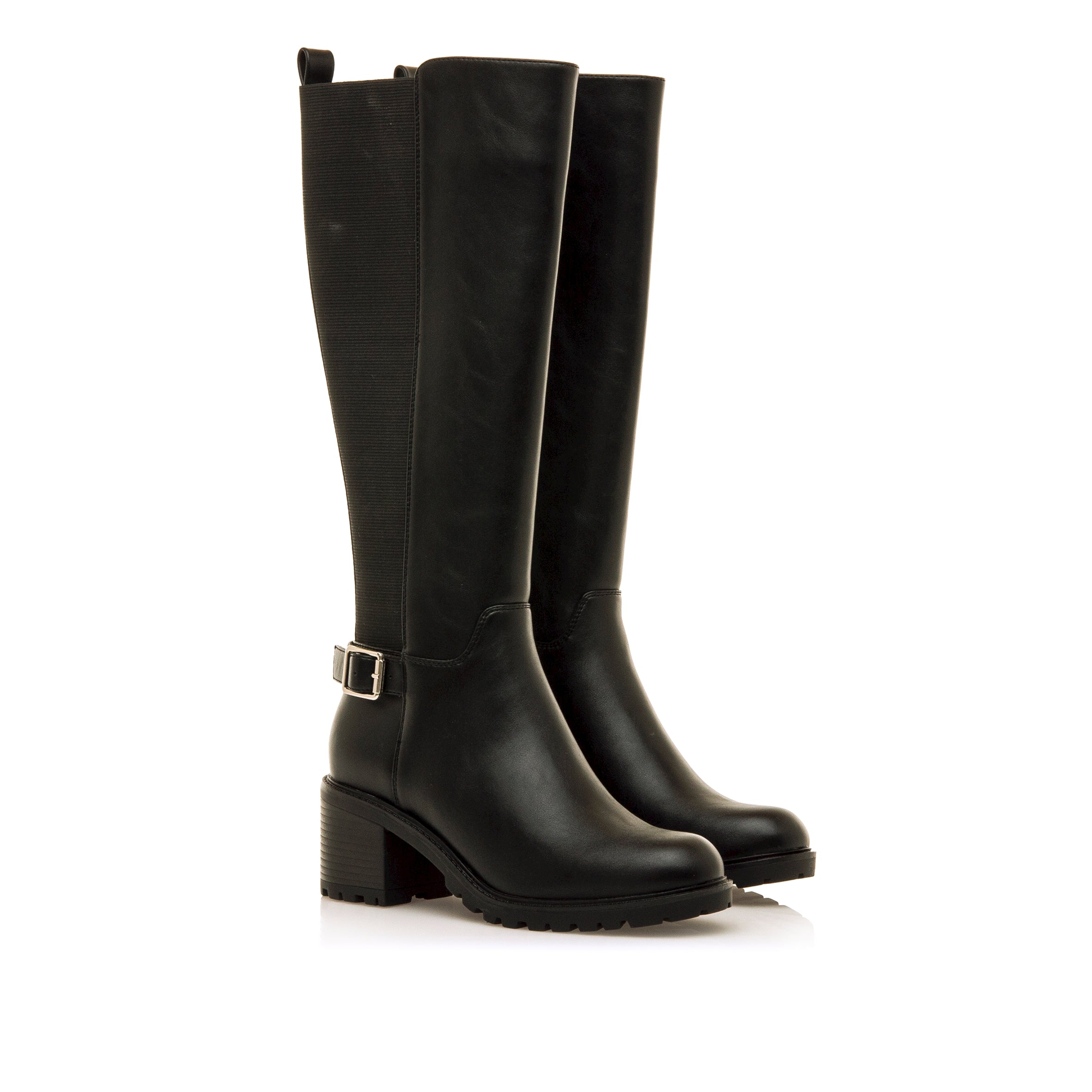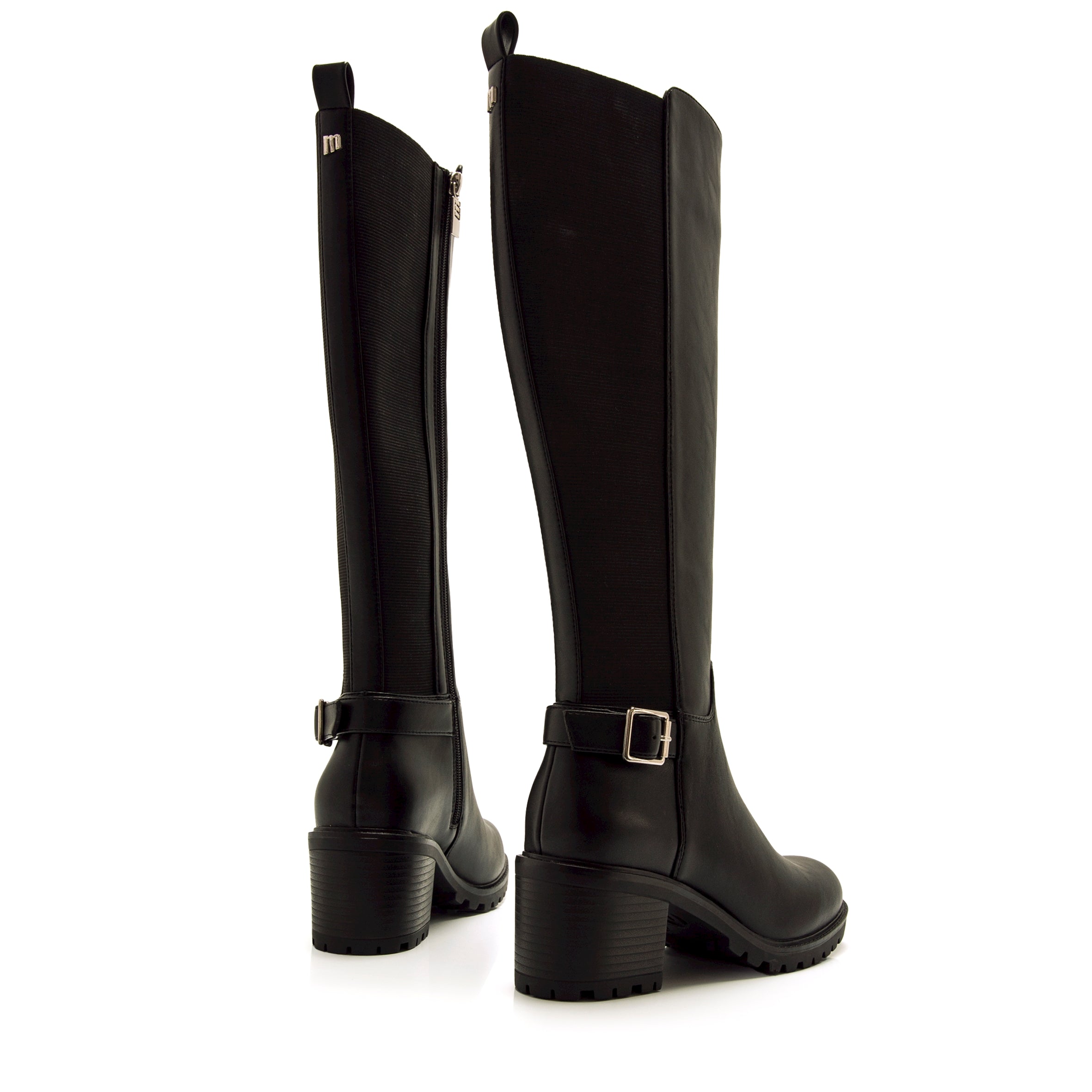 Botas de tacón de color negro para mujer, modelo Maya de Mustang de estilo urbano con inspiración ecuestre. Diseñada con caña alta lisa y elástica en la parte trasera para un mejor ajuste, incluye una hebilla metálica plateada decorativa en el lateral que aporta un toque decorativo. Su tacón ancho junto con la suela con relieve garantizan comodidad y buen agarre. Fabricado con un 60% de algodón reciclado post consumo y un 40% de algodón convencional. Ideal para looks de invierno que buscan practicidad sin perder estilo.