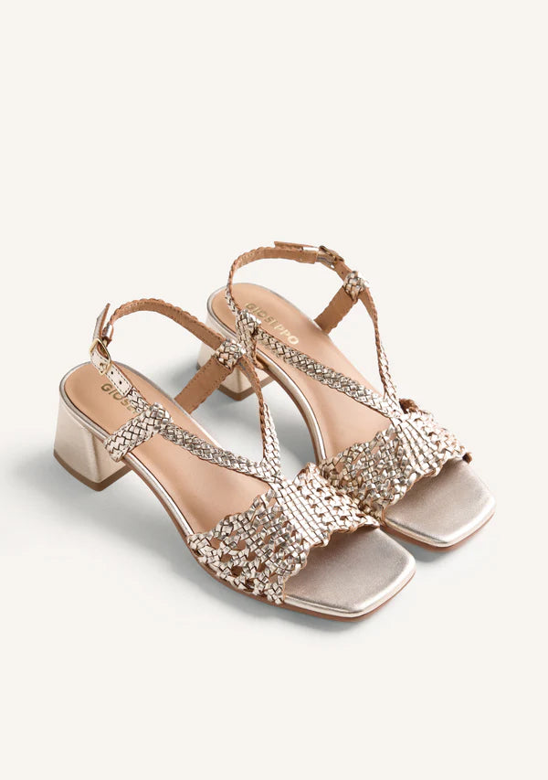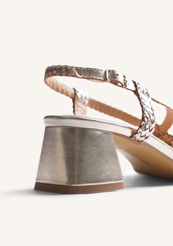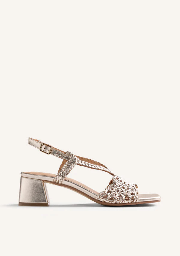 Sandalias de piel trenzada a mano con acabado metalizado. Tacón tipo bloque. Cuentan con planta acolchada y cierres ajustables en el tobillo. Altura tacón: 4,5 cm.