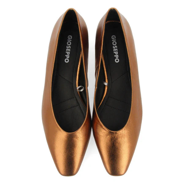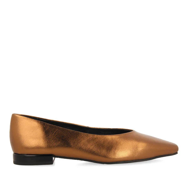 Un básico que elevará cualquier de tus looks. Bailarinas color bronce con punta fina y tacón negro. Corte, plantilla y forro en piel curtidos mediante un proceso de curtación más sostenible bajo los estándares de Leather Working Group. Plantilla muy acolchada de látex para asegurar un mayor confort. Piso flexible.