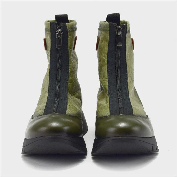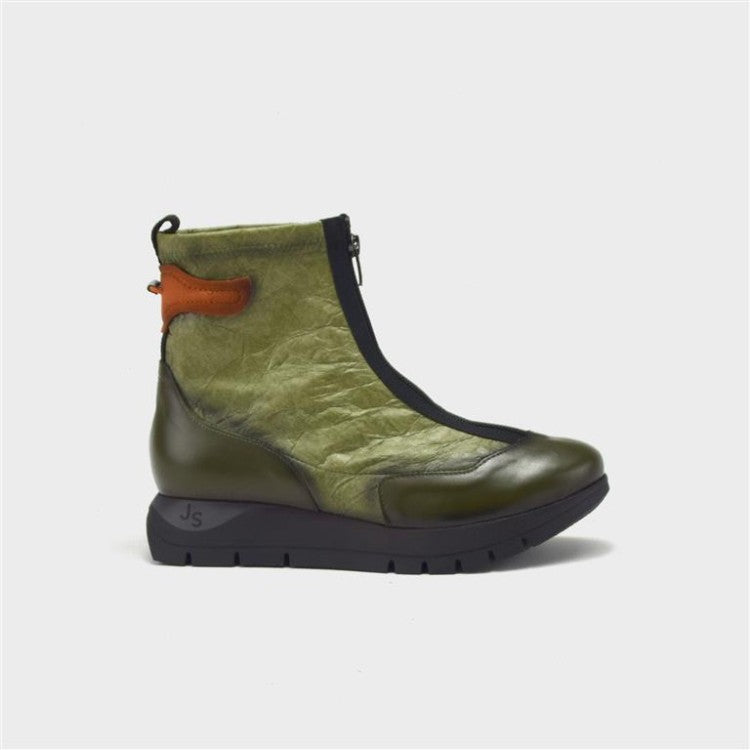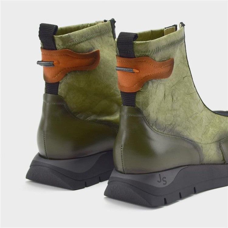Botín suela adeportivada en piel color verde kaki con cremallera central. Detalles en suede y elástico naranja.