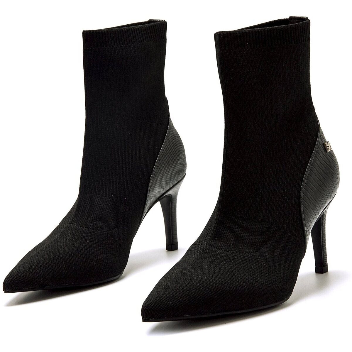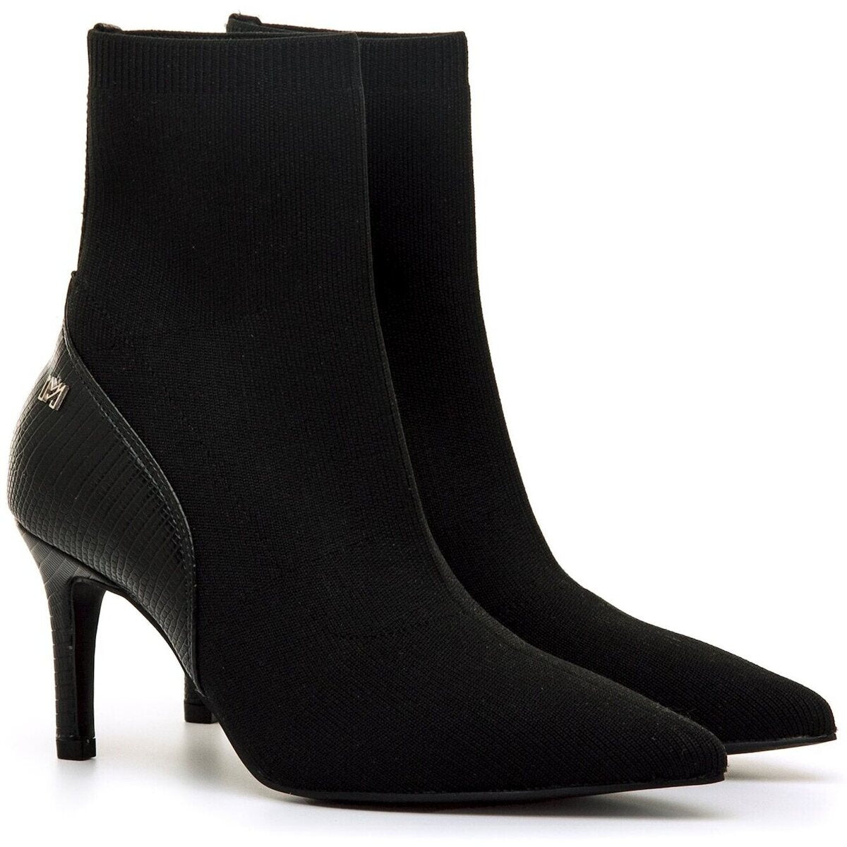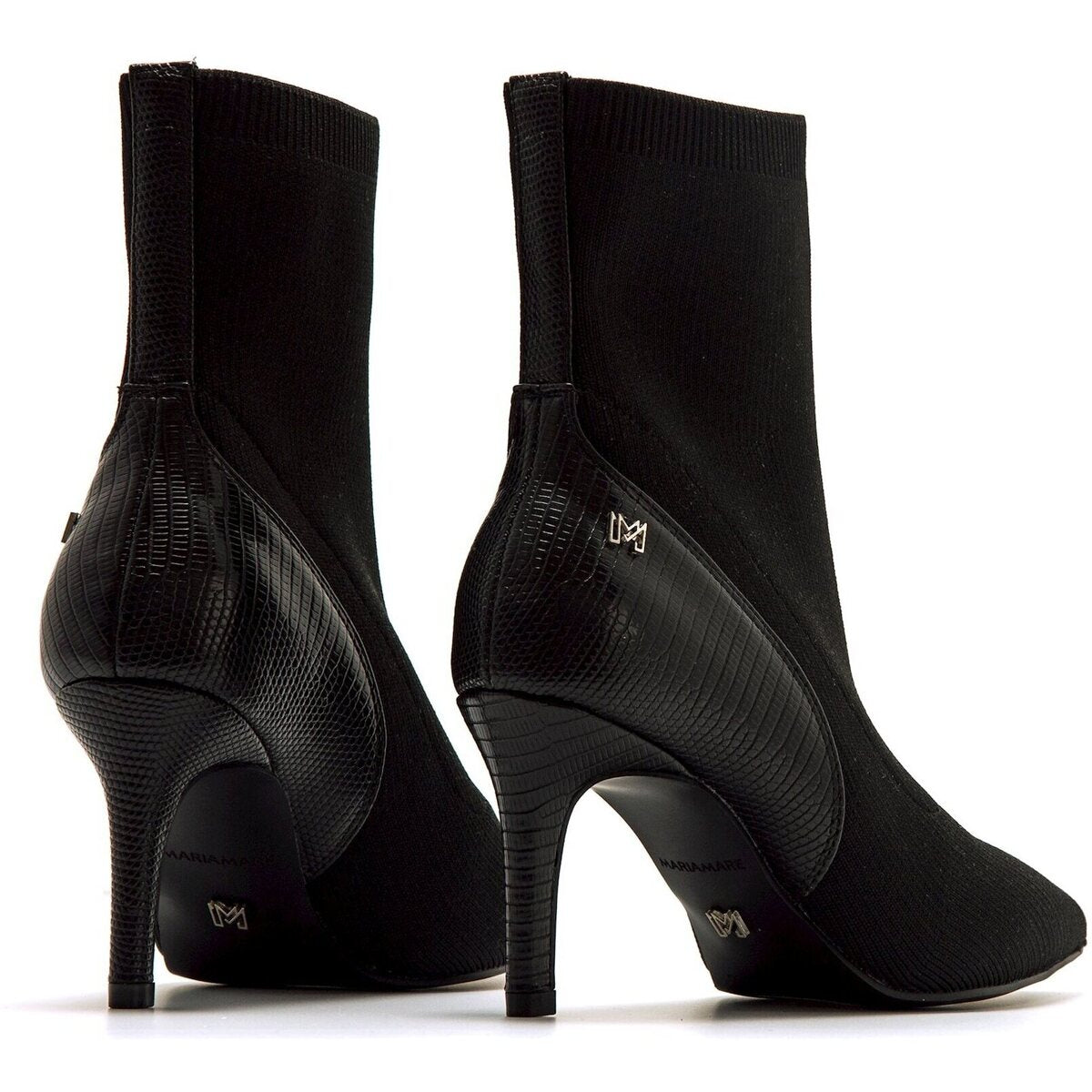 Botines negros de tacón para mujer, modelo Nuoro de Mariamare con diseño tipo calcetín. Su ajuste elástico se adapta al pie y al tobillo, ofreciendo una sensación cómoda y estilizada. La puntera fina y el detalle texturizado en la parte trasera aportan un toque moderno y elegante. El tacón alto realza la figura sin renunciar a la estabilidad.