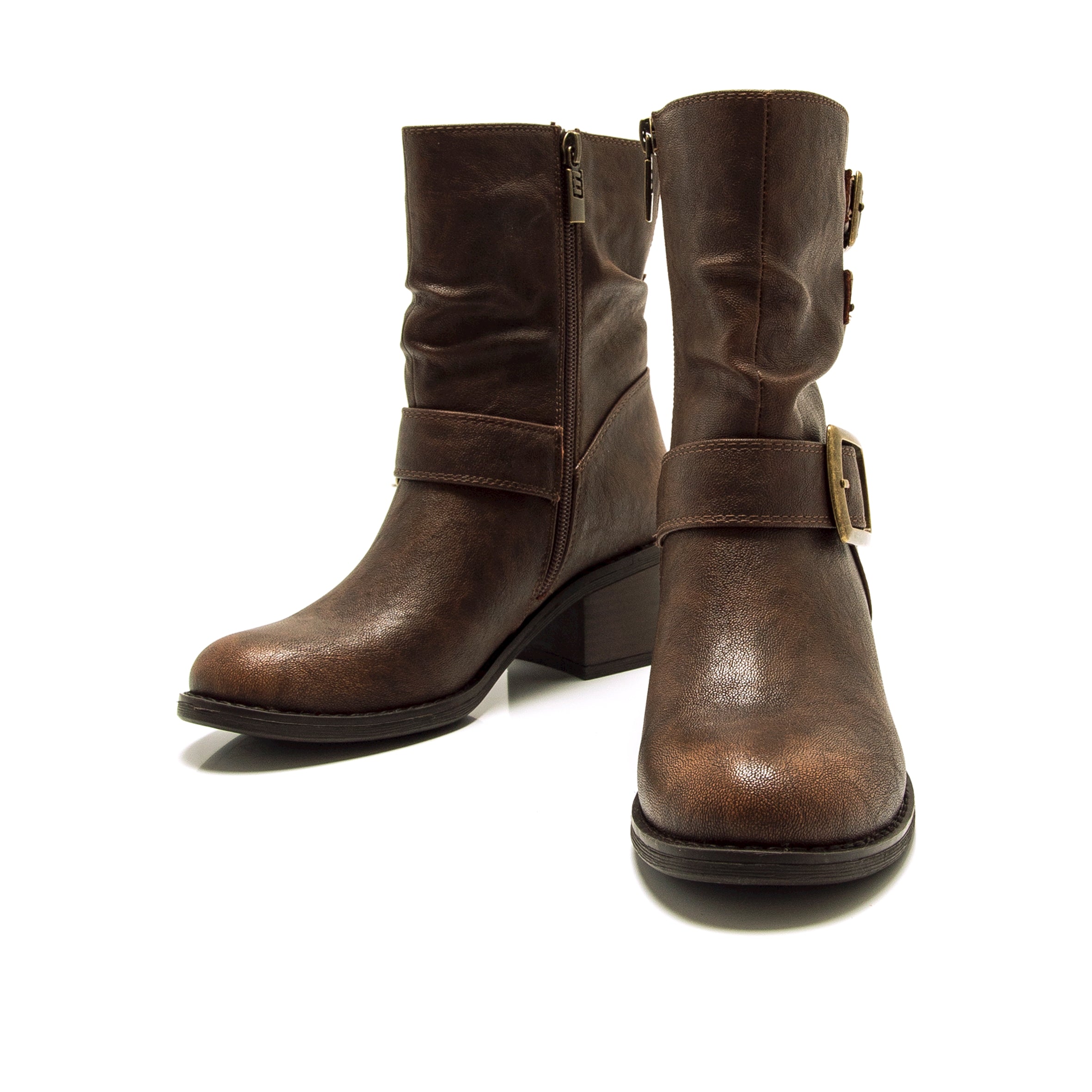 Botín de color cuero para mujer de la marca Mustang, modelo Persea de estilo biker. Con una caña baja arrugada y decorado con dos hebillas metálicas doradas en la parte superior y otra al tobillo, este diseño ofrece un look robusto y funcional. El tacón ancho proporciona una base estable y cómoda para el uso diario, mientras que la cremallera lateral permite un calce práctico. Ideal para dar un aire informal con carácter a tus conjuntos de temporada.