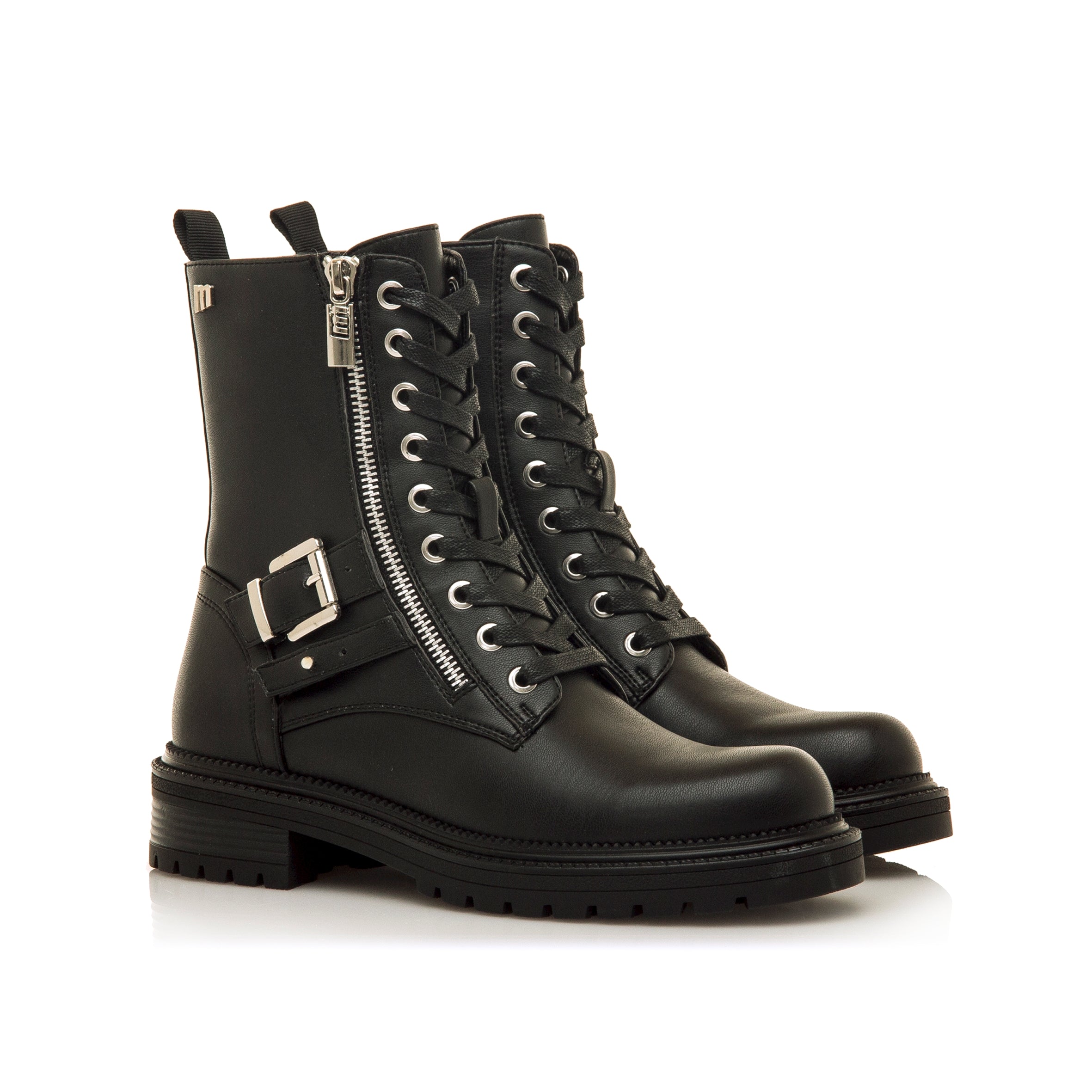 Botines para mujer de la marca Mustang, modelo Campa de color negro. Este diseño combina estilo biker y militar con detalles modernos como una cremallera lateral decorativa y una hebilla metálica ajustable que aportan personalidad y un toque atrevido. La suela con relieve y el cierre de cordones garantizan comodidad y un ajuste perfecto. Estos botines son la elección perfecta para quienes buscan funcionalidad y estilo en un calzado diario.